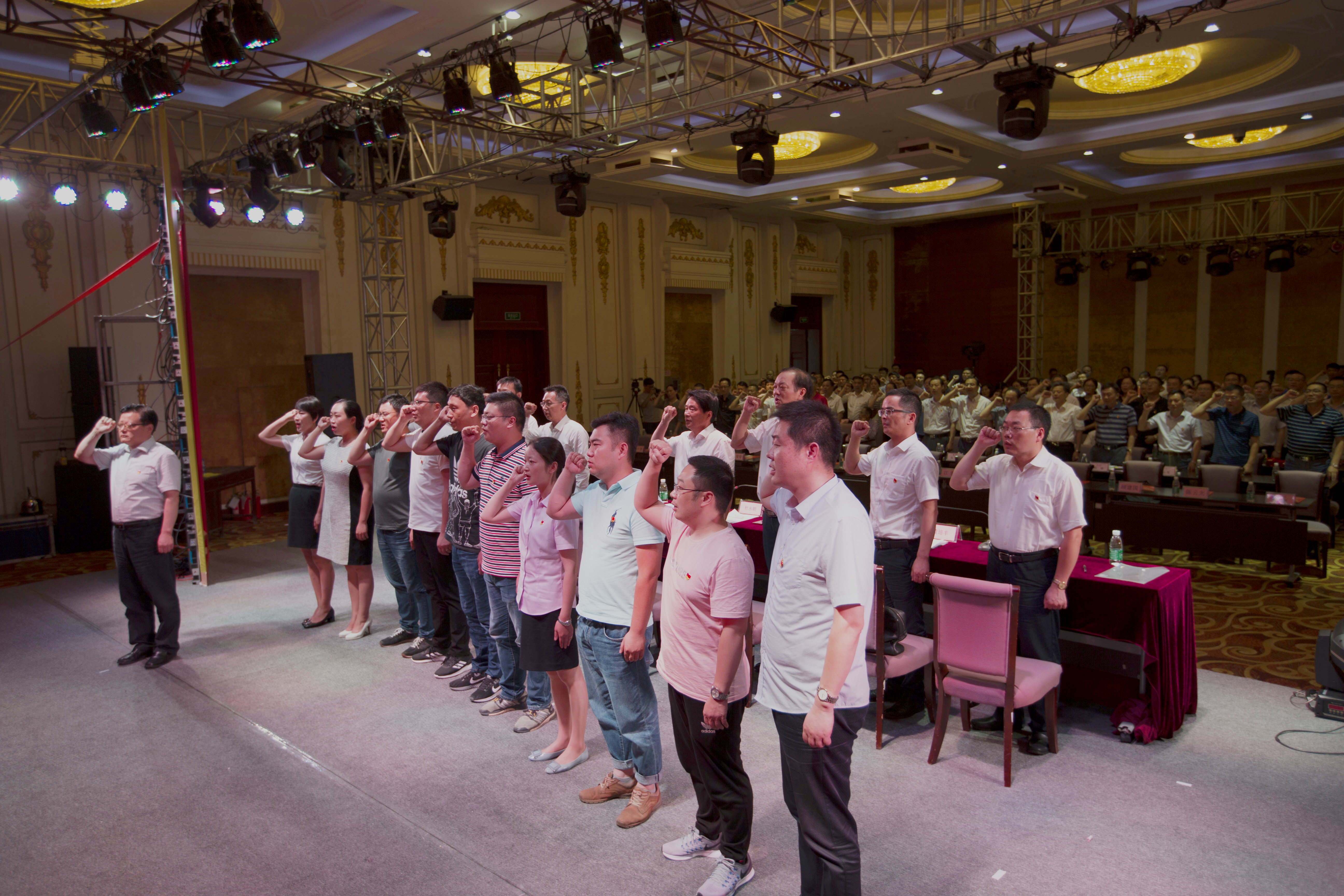 产控集团党委副书记、副董事长、总经理陆强新带领新党员进行入党宣誓仪式,全体与会党员庄严起立,举起右拳,重温入党誓词。